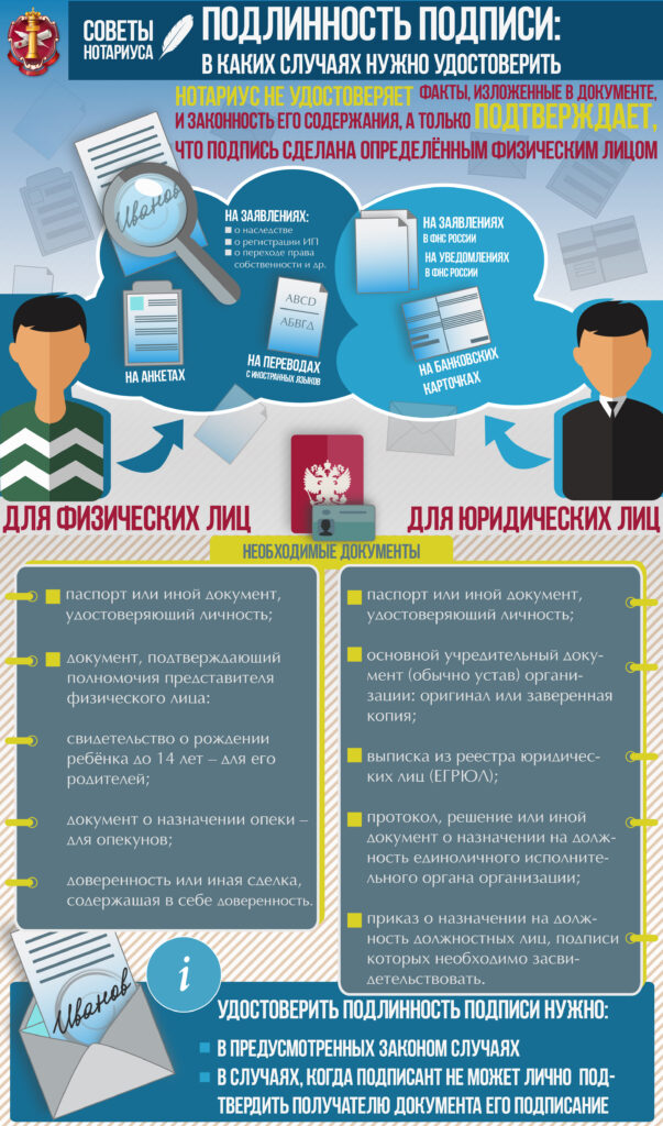 Свидетельствование подлинности подписи бывает необходимо и физическим, и юридическим лицам в самых разных ситуациях. Засвидетельствовать подлинность подписи можно практически на любом подписываемом документе. Свидетельствование подлинности подписи на документах необходимо, если требуется официально подтвердить, что документ подписан определённым лицом, как в случаях, прямо предусмотренных законом, так и в иных случаях. В частности, распространено свидетельствование подлинности подписи в ситуации, когда подписант не может лично подтвердить получателю документа его подписание (при отправке заявления или иного документа по почте, с доверенным лицом и др.).