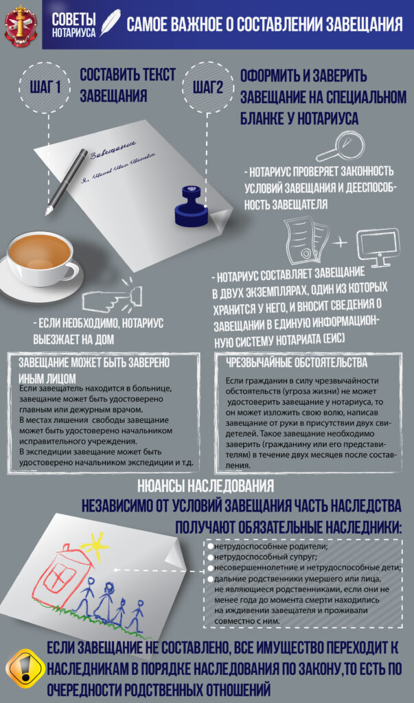 Нотариус обязательно проверяет дееспособность лица, совершающего завещание (в ГК сказано, что завещатель «должен быть полностью дееспособен»), а также законность условий, которые лицо желает включить в завещание. Завещание составляется в двух экземплярах, один из которых хранится у нотариуса. Кроме того, он вносит сведения о составленном завещании в Единую Информационную Систему нотариата (ЕИС). Это делается для того, чтобы в случае, если, например, завещание утеряно, наследники могли восстановить его текст.